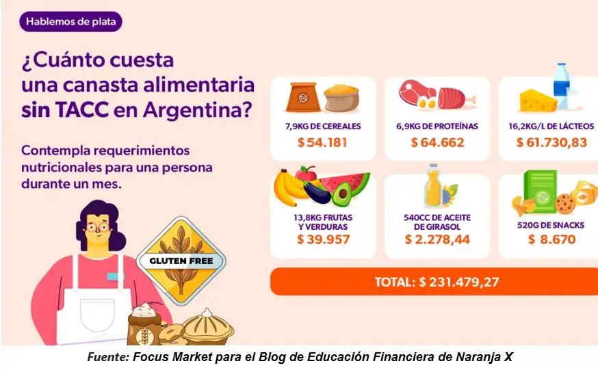 Según el relevamiento, la canasta básica alimentaria tradicional alcanza un valor mensual de $ 206.137,28 por persona. En cambio, la canasta sin TACC asciende a $ 231.479,27 mensuales. El análisis parte de seis categorías alimentarias comunes a ambos modelos: cereales, proteínas, lácteos, frutas y verduras, aceite y snacks.