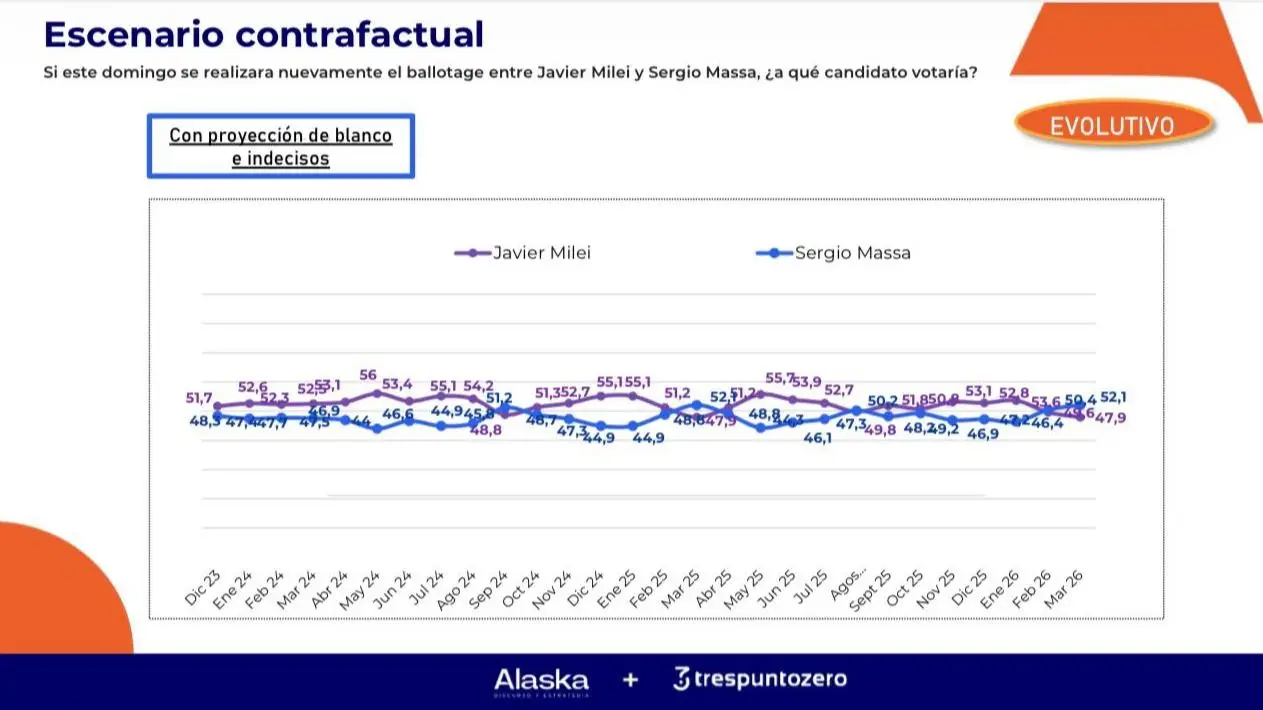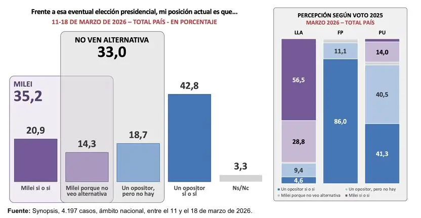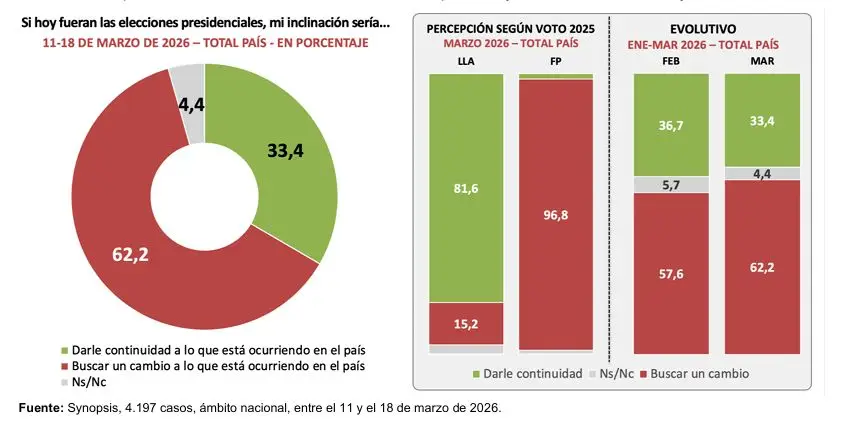 La encuesta de marzo de Synopsis, la consultora que dirige Lucas Romero, registró un crecimiento de quienes se inclinan por un cambio de gestión en 2027: pasaron del 57,6% al 62,2%, frente a un 33,4% que considera que debe continuar el rumbo libertario. Sin embargo, dentro de esa mayoría que desea un cambio, sólo un 42,8% aseguró que votará a un candidato opositor sí o sí. En cambio, un 18,7% afirmó no encontrar una opción de cambio atractiva, entre ellos un 11,1% de quienes votaron a Fuerza Patria en octubre pasado. Ese universo podría inclinarse por quedarse en su casa el día del comicio, una tendencia que se viene repitiendo elección tras elección y que ya marcó récords de inasistencia.
