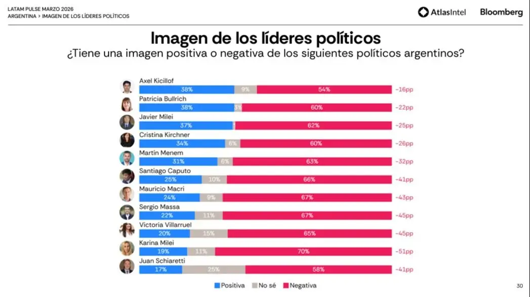 Las encuestas de marzo muestran una fuerte caída en la aprobación a la gestión de Javier Milei y una incipiente recuperación de los principales referentes del peronismo. El traspaso de apoyos todavía es muy lento. Muchos dicen querer una alternativa, pero no registran a Fuerza Patria como una opción votable. “Es normal, falta un año y medio para las elecciones. Pero claramente Axel es el mejor posicionado”, respondían cerca del gobernador Kicillof. En la última encuesta de AtlasIntel apareció como el dirigente con mejor imagen y, además, el viernes recibió un espaldarazo desde Estados Unidos con el fallo por YPF. Pero no es el único. En los últimos días, el ex gobernador Sergio Uñac y el ex ministro Sergio Massa también dieron señales de querer proyectarse en el juego nacional.