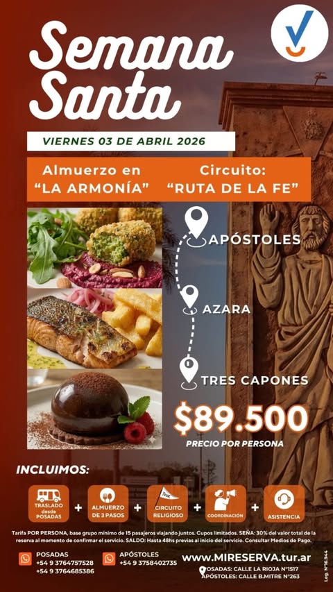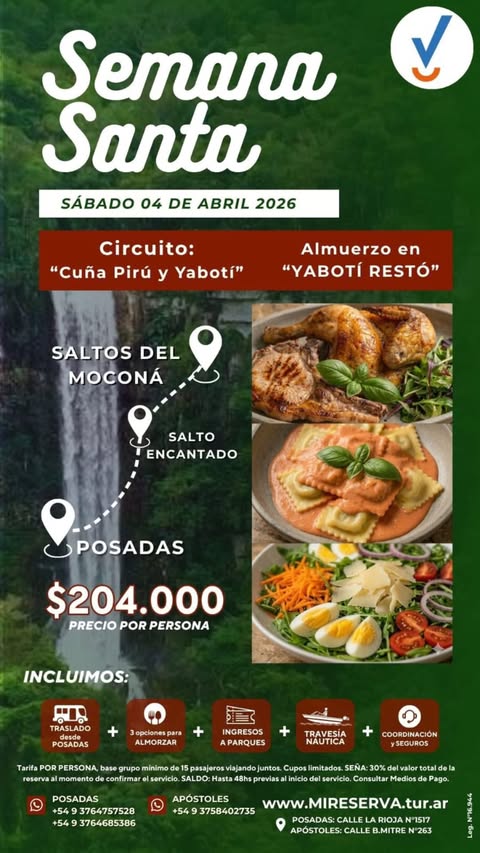 Las opciones incluyen traslados privados o grupales, guías profesionales y servicios gastronómicos. Según Gómez, los paquetes presentan valores definidos: “El paseo al sur por el Viernes Santo cuesta 89.500 pesos y el de Moconá 200 mil pesos, con todo incluido”, afirmó. Además, indicó que existen facilidades de pago con tarjetas y programas provinciales.