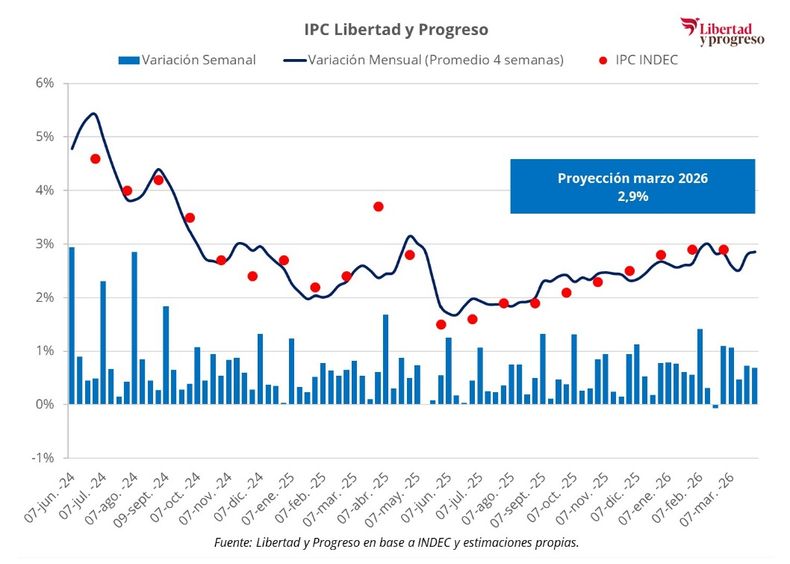 Por su parte, la Fundación Libertad y Progreso (IPC LyP) proyecta que la inflación de marzo también se ubicaría en 2,9%, pese a detectar una moderación en la velocidad del alza de precios a nivel general. "El principal impulso alcista provino de Transporte. En la última semana, el rubro registró una suba del 6%, acelerándose respecto de semanas previas, y aportó 0,7 puntos porcentuales al índice general", detallan.