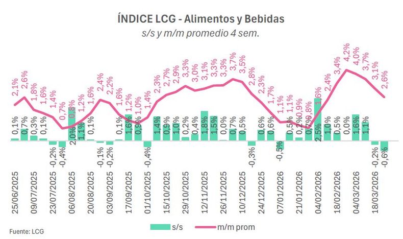Al momento de hacer referencia a lo ocurrido con el rubro Alimentos y Bebidas, desde LGC señalaron a C5N que durante la última semana "nuestro relevamiento de precios marcó una leve caída de precios del 0,6%. En las últimas 4 semanas la inflación promedio alcanzó el 2,6% mensual, desacelerando por cuarta semana consecutiva".